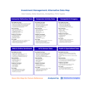 To put the space in context, we’ve mapped six major categories of alternative data in investment management – covering use cases, data gathering techniques, analytical approaches, and the types of firms most likely to apply them.